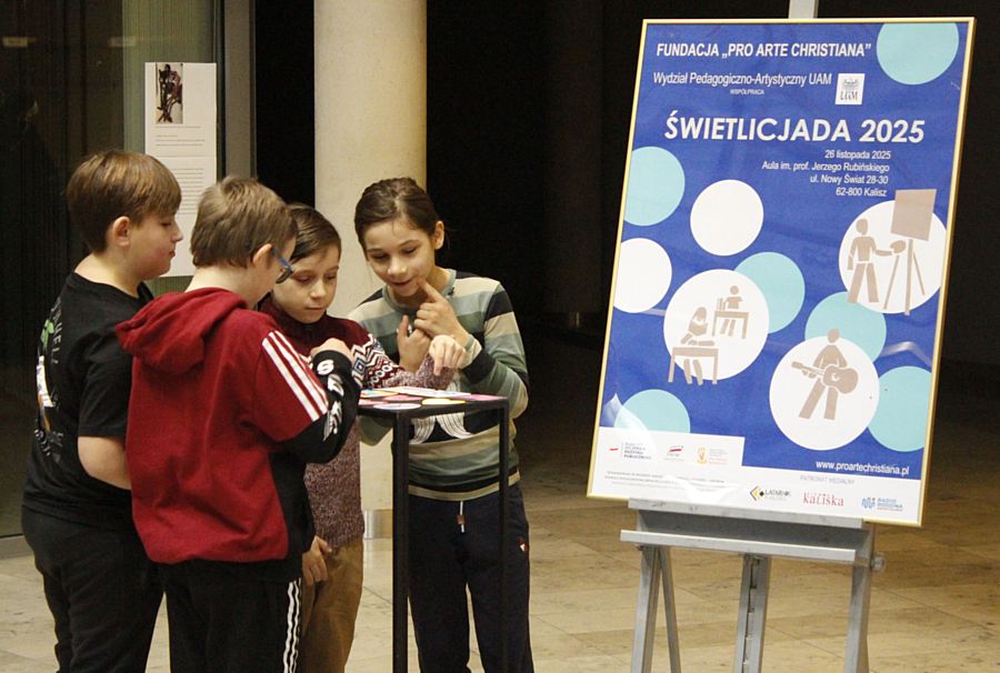 26 listopada br. odbyło się podsumowanie projektu Świetlicjada 2025 zrealizowanego przez Fundację Pro Arte Christiana we współpracy z Wydziałem Pedagogiczno-Artystycznym w Kaliszu Uniwersytetu im. Adama Mickiewicza w Poznaniu,  w ramach którego dzieci z sześciu kaliskich świetlic socjoterapeutycznych: Świetlica „Pinokio” Stowarzyszenia Katolicki Ruch Antynarkotyczny KARAN, Świetlica „Nazaret” Zgromadzenia Sióstr Nazaretanek, Świetlica „Św. Doroty” Zgromadzenia Sióstr Nauczycielek Św. Doroty Córki Najświętszych Serc, Świetlica Socjoterapeutyczna „Samarytanin”   Caritas Diecezji Kaliskiej, Świetlica „Wzrastanie w wierze i miłości”  Parafii Opatrzności Bożej, Świetlica środowiskowa z elementami socjoterapii „Anielska Ostoja” przy parafii katedralnej św. Mikołaja w Kaliszu uczestniczyły w warsztatach muzycznych i plastycznych prowadzonych przez artystów, wykładowców Wydziału Pedagogiczno-Artystycznego: prof. UAM dr hab. Monikę Kostrzewę, dr Annę Sobczyk-Gąsiorek, dr Beatę Michalak-Konieczną, Dorotę Wróblewską, Małgorzatę Biniek oraz Annę Karolak i Bernarda Kostrzewę. Podczas warsztatów dzieci poznawały różne techniki plastyczne i zasady kompozycji dzieła plastycznego, gatunki muzyczne, instrumenty perkusyjne oraz techniki wokalne. Projekt zakończyło spotkanie na Wydziale Pedagogiczno-Artystycznym połączone z otwarciem wystawy prac dzieci oraz z prezentacją filmu dokumentującego warsztaty muzyczne.